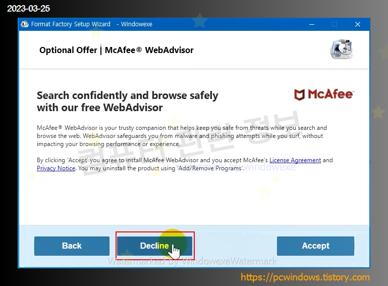 McAfee WebAdvisor 스폰서 프로그램을 설치할건지 물어보는데 Decline 클릭