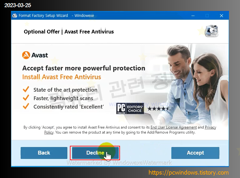 Avast 백신 스폰서 프로그램을 설치할건지 물어보는데 Decline 클릭