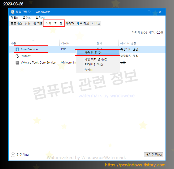 자동 실행을 중지시키려면 작업관리자 - 시작 프로그램 탭에서 SmartVersion 을 마우스 우클릭해서 사용안함으로 변경하면 됩니다.