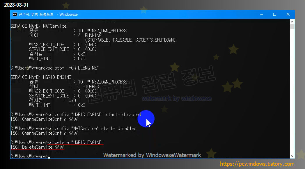 SC DeleteService 성공 이런 메세지가 나와야 됩니다.