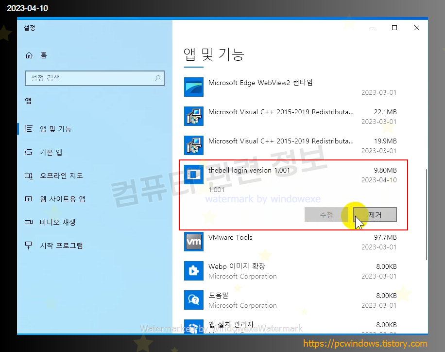 thebell login version 1.001 를 찾아서 제거클릭
