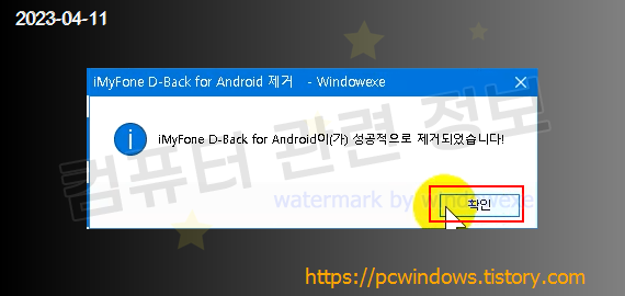 프로그램이 정상적으로 제거되었습니다. 확인 클릭.