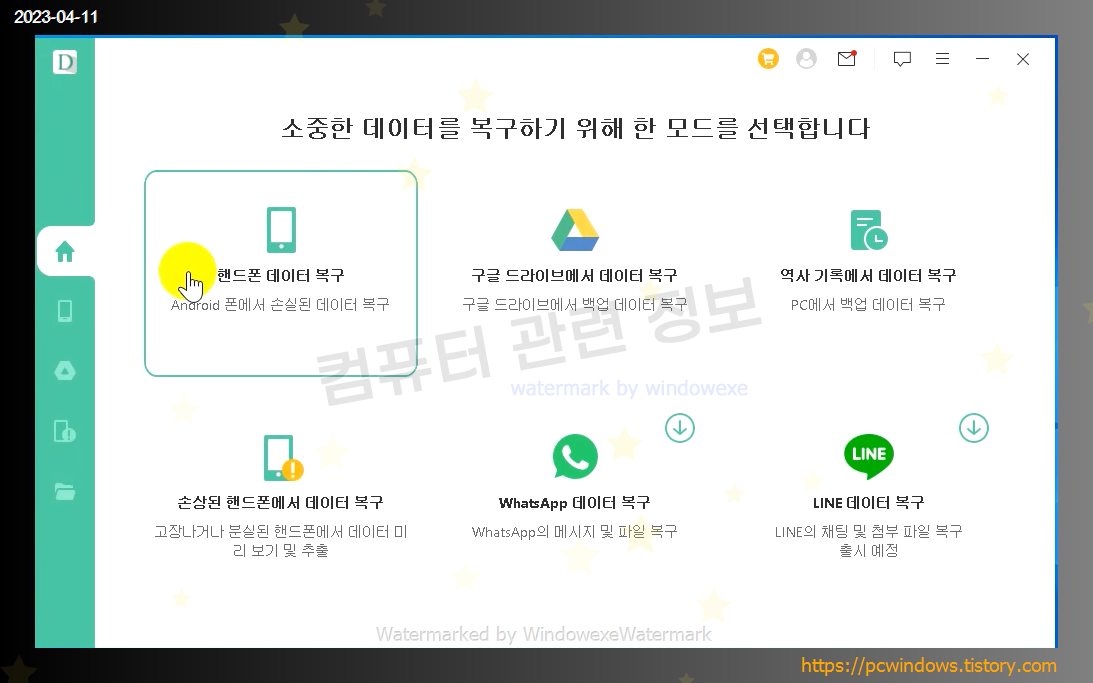 핸드폰 데이터 복구, 구글 드라이브 복구, 컴퓨터 데이터 복구, 와츠앱 및 라인 데이터 복구 기능이 있습니다.