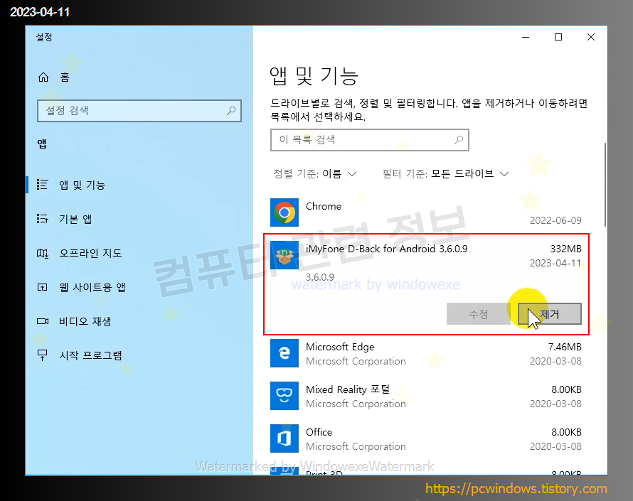 iMyFone D-Back for Android 를 찾아서 제거클릭