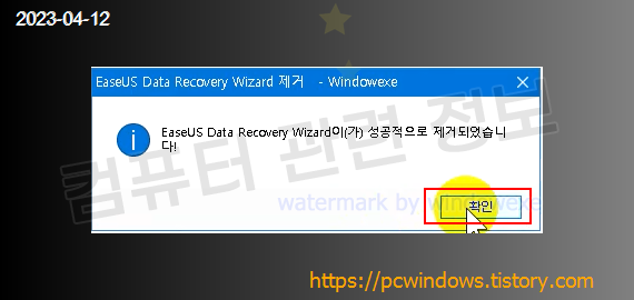 프로그램이 정상적으로 제거되었습니다. 확인 클릭.