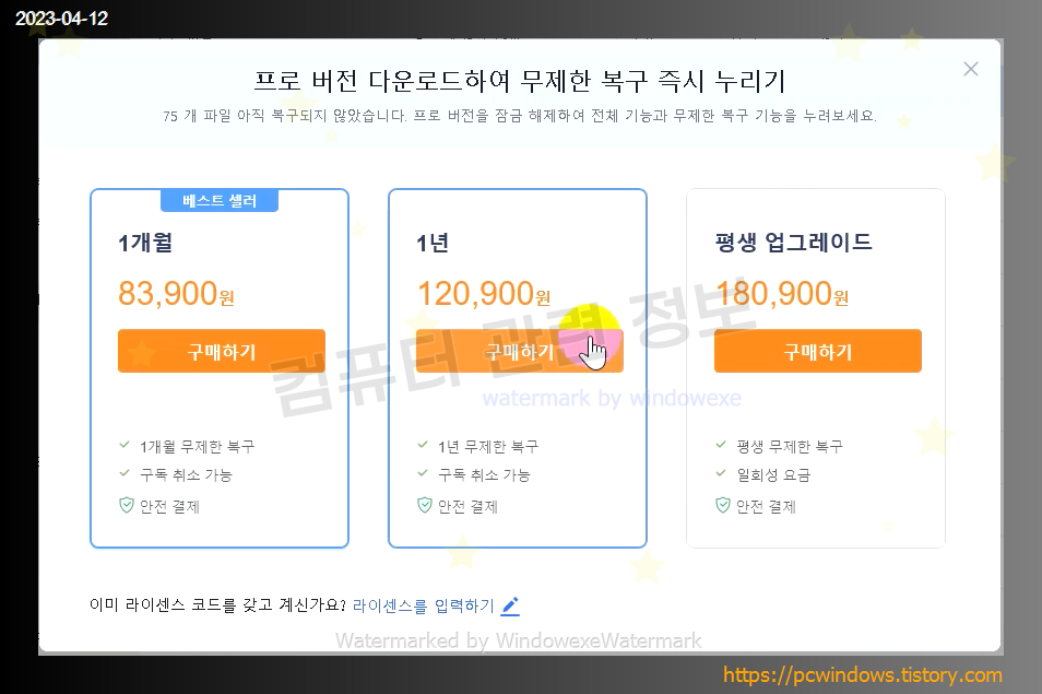 무료 및 유료, 무료로 데이터를 복구할 수 있는 파일은 제한적이라서 제품 등록이 필요함