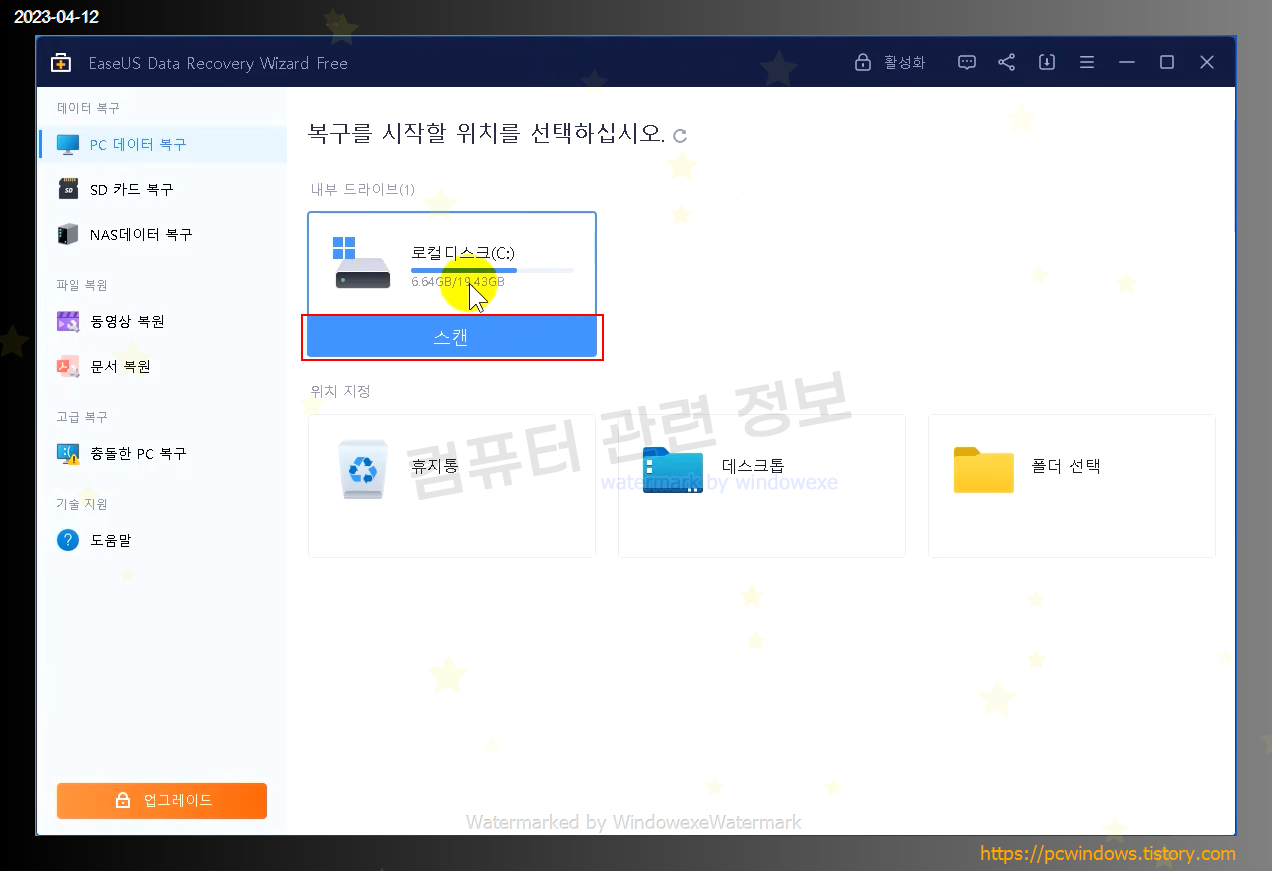 프로그램 간단 사용법입니다. 복구할 위치를 선택하고 스캔 클릭