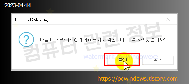 디스크 데이터가 지워진다는 메세지가 나옵니다. 확인 클릭