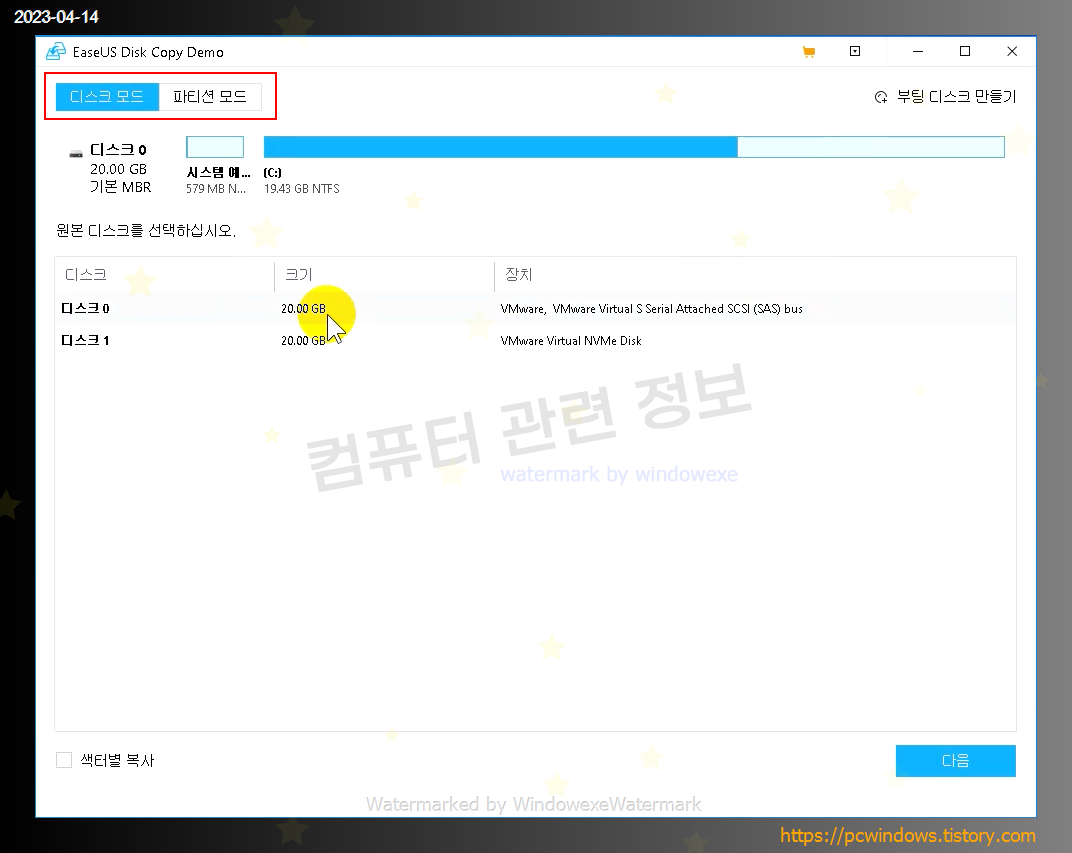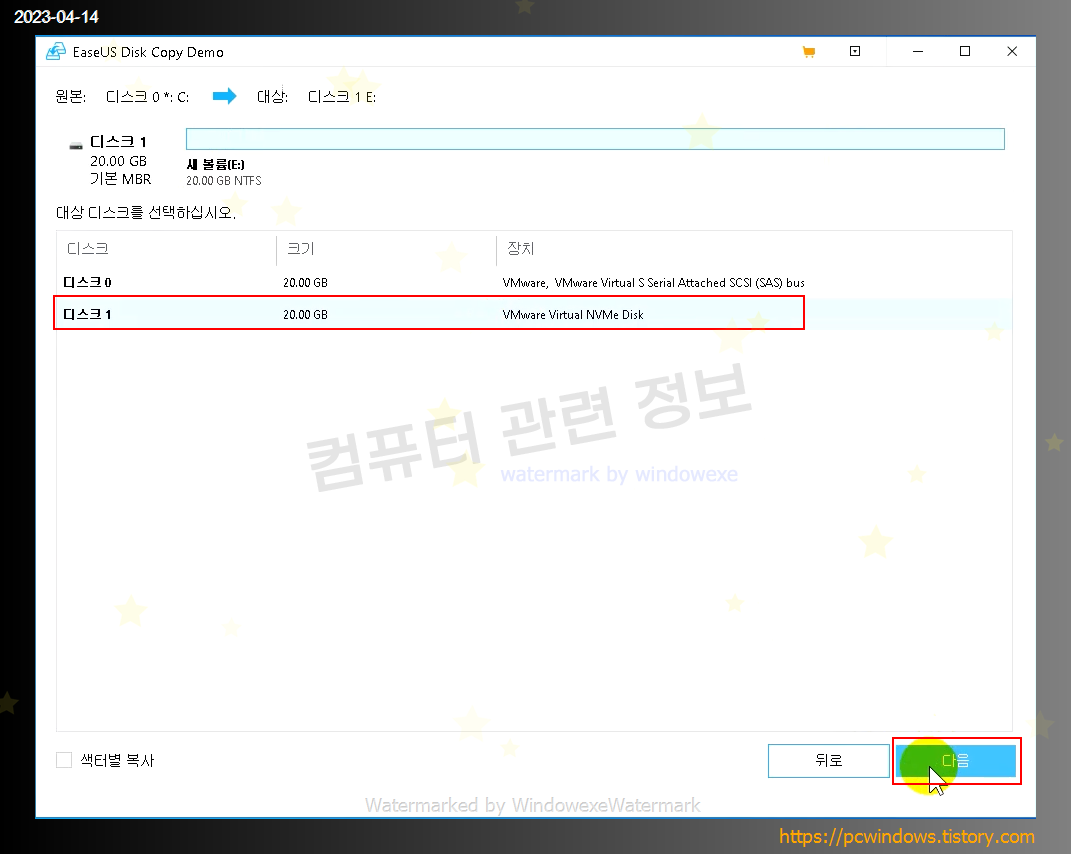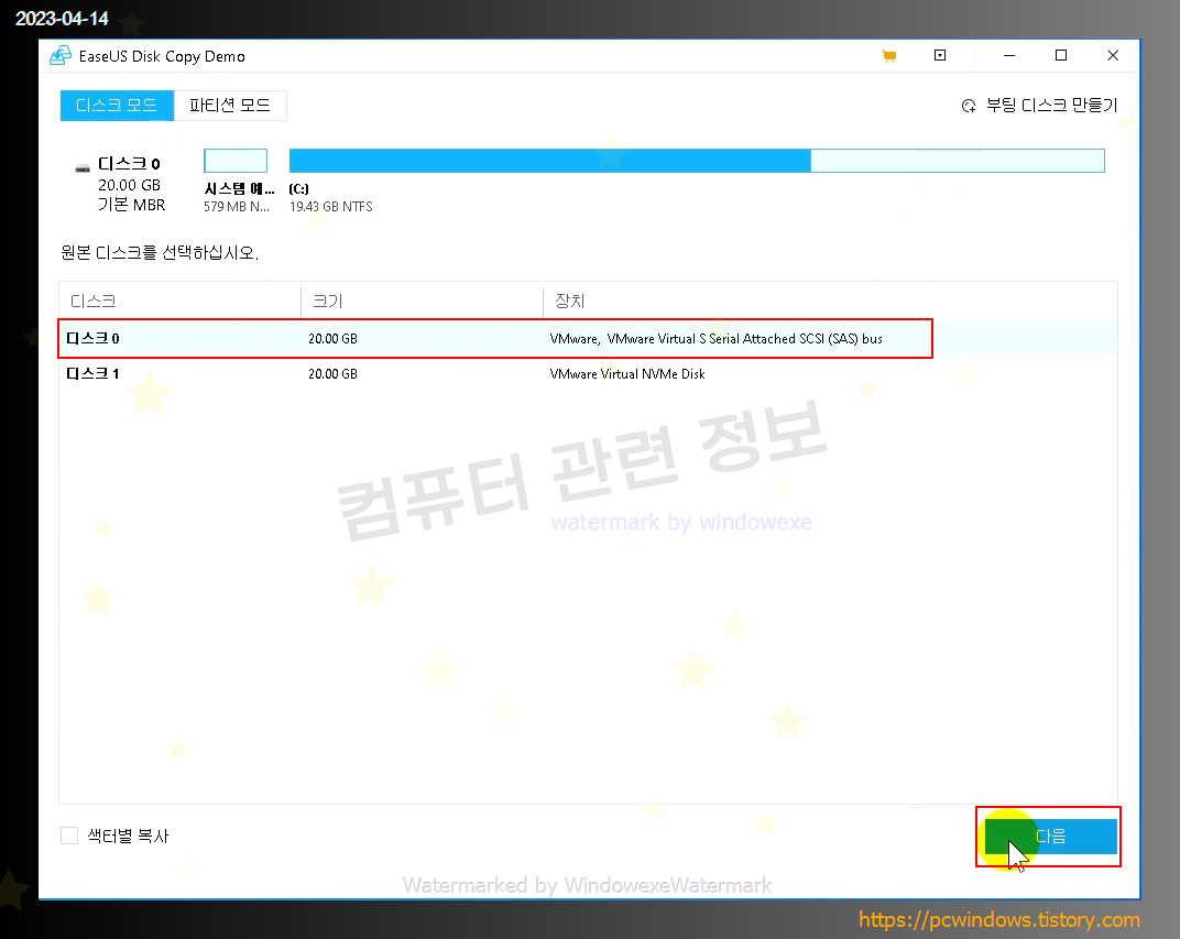 복사할 원본 디스크 선택후 다음 클릭