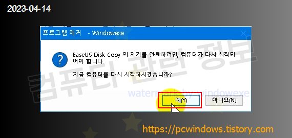 프로그램을 삭제할건지 물어보는데 예 클릭.