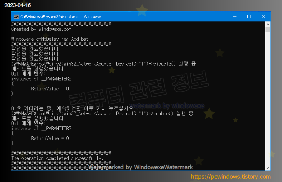 만들어진 배치파일을 관리자 권한으로 실행하면 레지스트리 값이 변경되고, 선택한 랜카드가 비활성화되고, 다시 활성화가 됩니다. (인터넷 연결이 잠시동안 끊깁니다.)