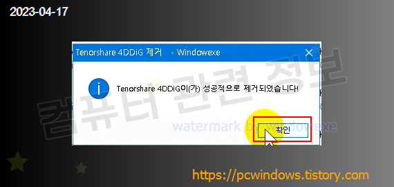 프로그램이 정상적으로 제거되었습니다. 확인 클릭.