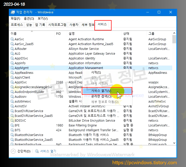 서비스 탭으로 이동해서 서비스 열기 클릭. (아무곳에서 우클릭)