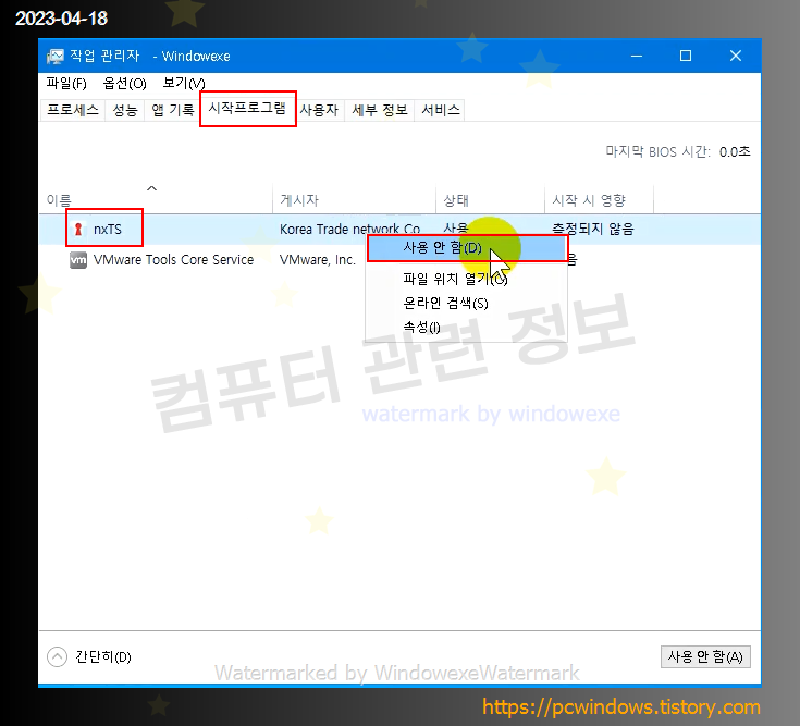 작업관리자 - 시작 프로그램 탭으로 이동해서 nxTS 를 마우스 우클릭, 사용 안함을 클릭하세요.