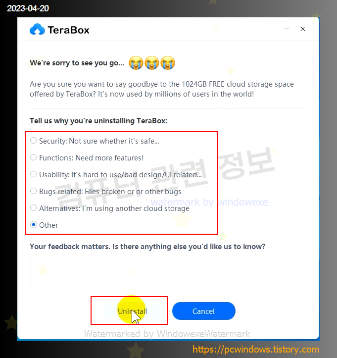프로그램 삭제 이유를 물어보는데 아무거나 선택하고 Uninstall 클릭
