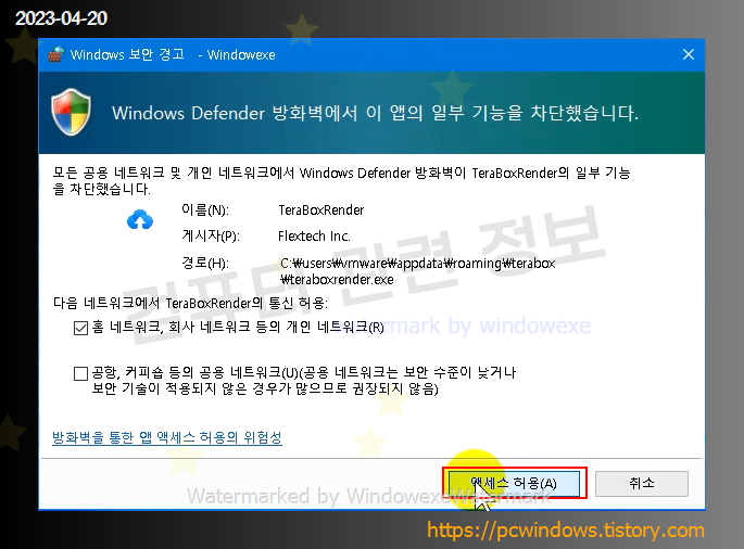 프로그램 설치 완료후 방화벽 알림 메세지가 나오면 액세스 허용을 클릭하세요.