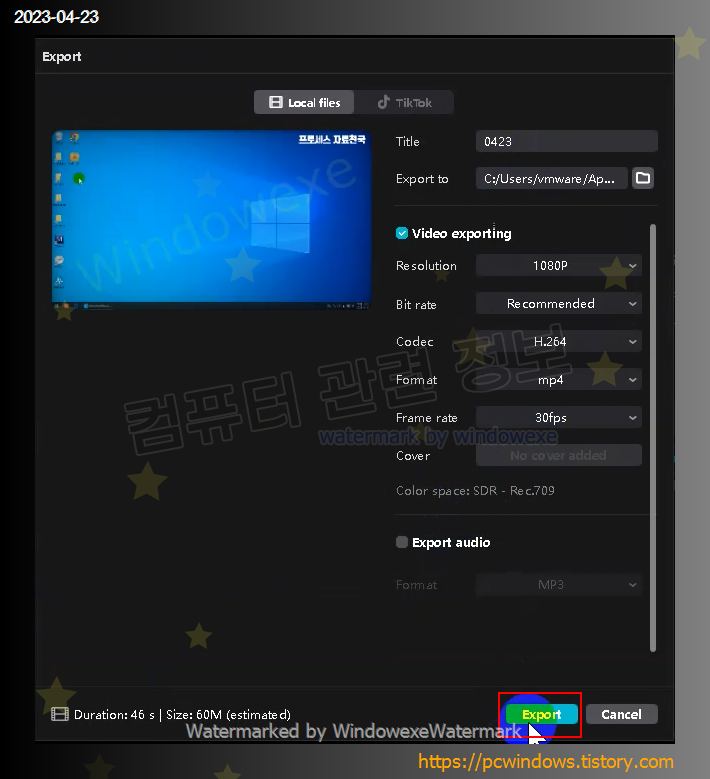 동영상 설정을 원하는 값으로 변경하고 Export 를 클릭하세요.