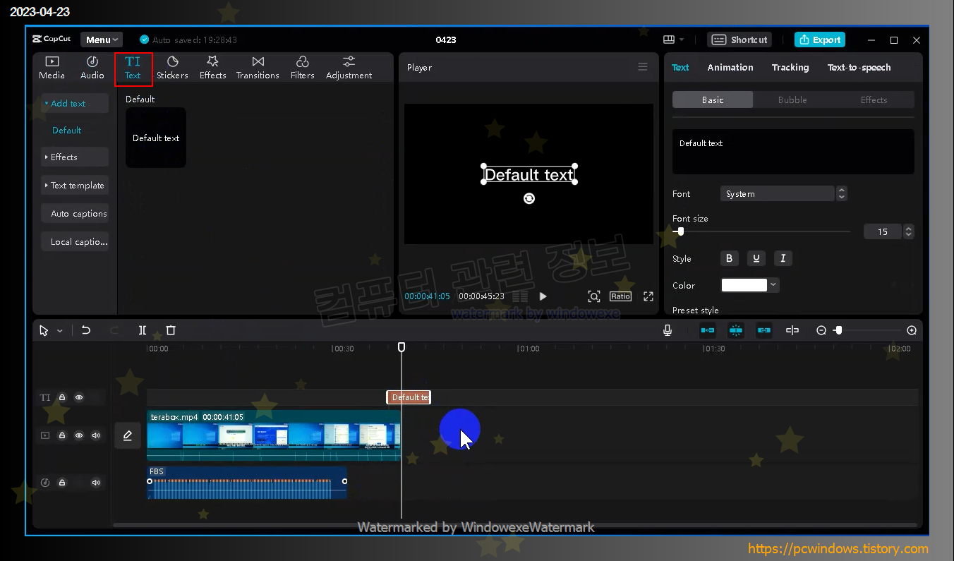 텍스트입력화면입니다. 자막등 화면에 텍스트를 삽입할 수 있습니다.