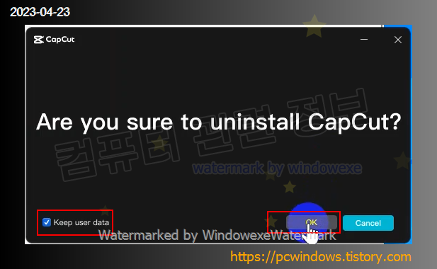 사용자 폴더에 있는 캡컷 데이터까지 모두 지우려면 Keep user data 에 체크해제하세요.