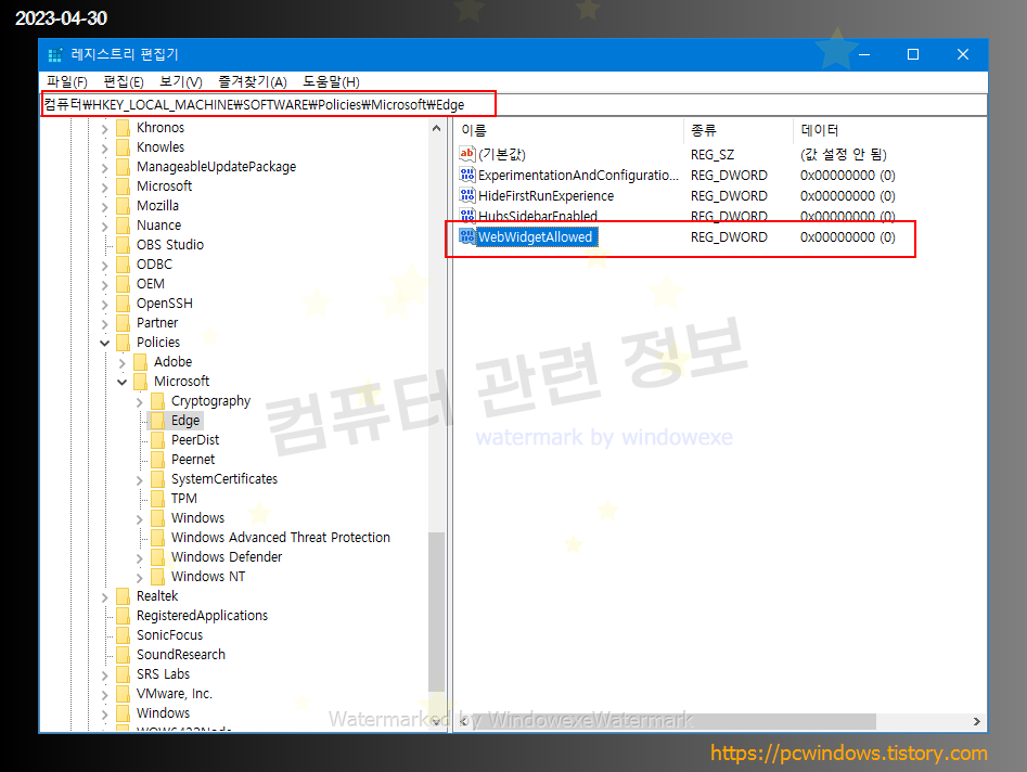 레지스트리 키를 변경하는 경우는 엣지 웹브라우저 프로세스를 모두 종료하고 다시 시작해야 적용됩니다.