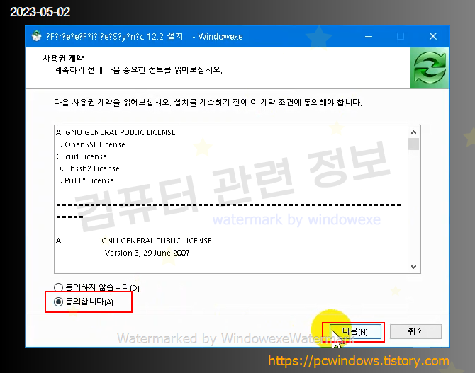 사용권 계약 내용이 나오는데 동의에 체크하고 다음 클릭.