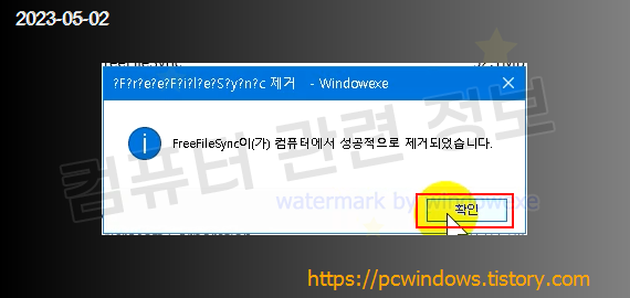 프로그램이 정상적으로 제거되었습니다. 확인 클릭.