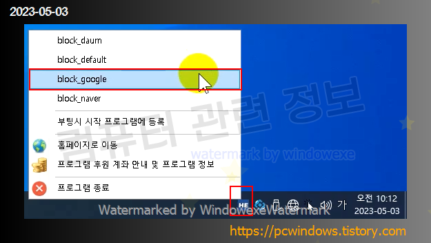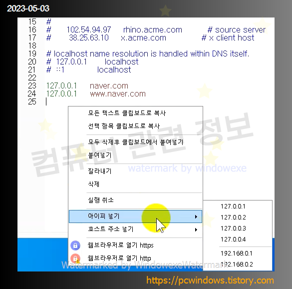 작업표시줄 오른쪽 시스템 트레이 아이콘에서 우클릭하고 작업한 hosts 파일을 클릭하세요.
