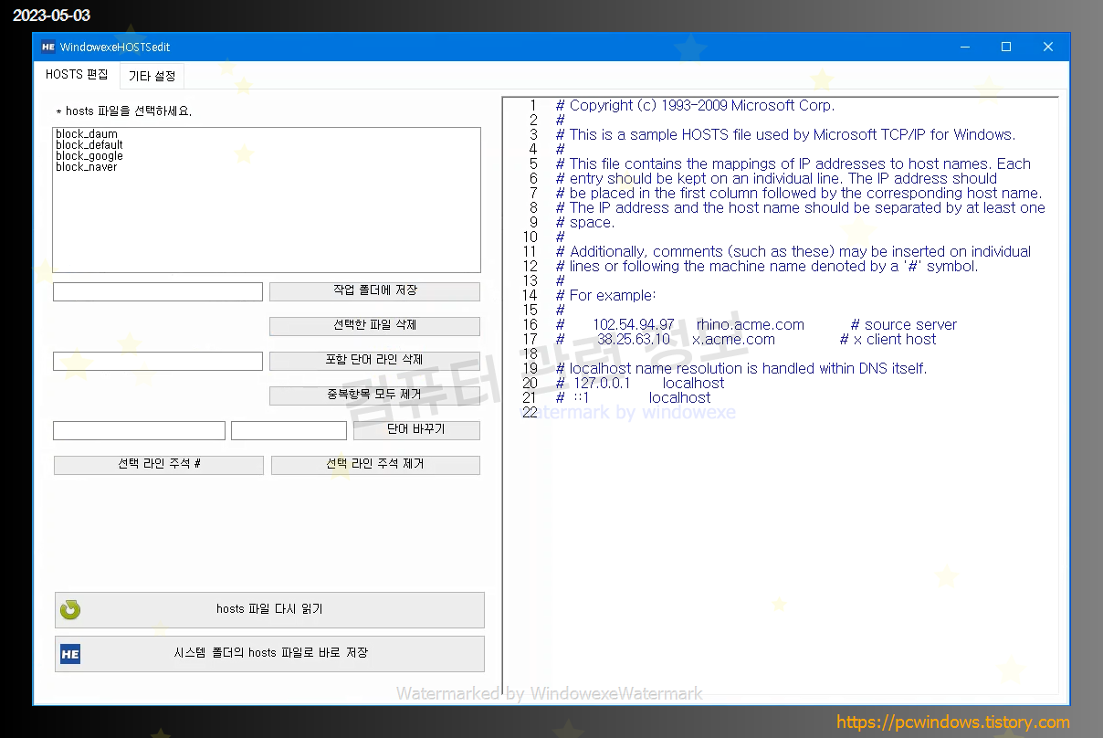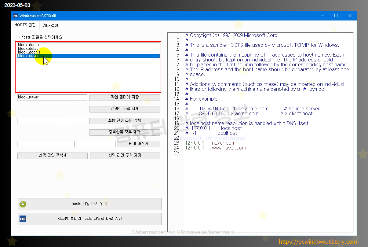 왼쪽 상단에는 프로그램이 실행되는 폴더에 있는 txt 파일이 표시되고, 오른쪽에는 hosts 파일의 내용이 표시됩니다.