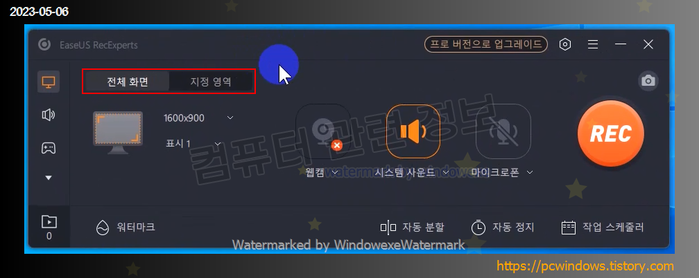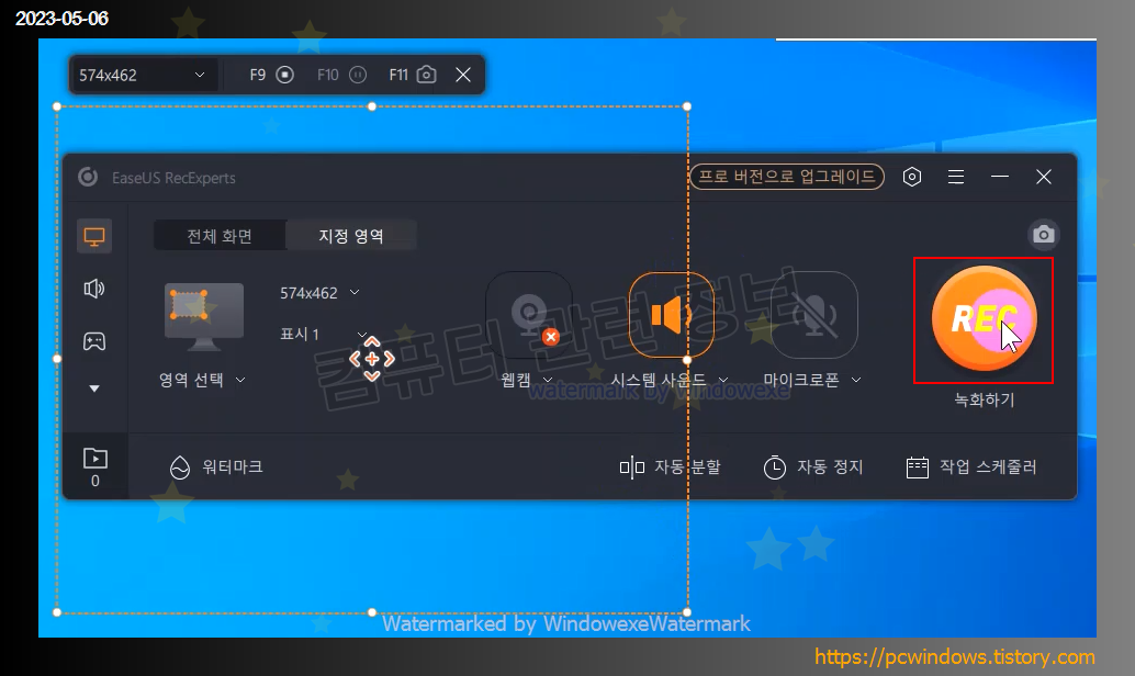 지정 영역을 클릭하면 원하는 영역에서 녹화가 가능합니다.