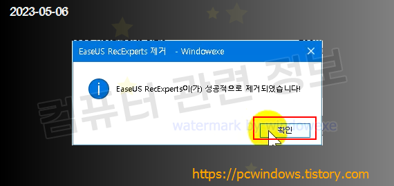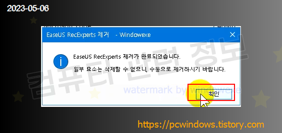 프로그램이 정상적으로 제거되었습니다. 확인 클릭.