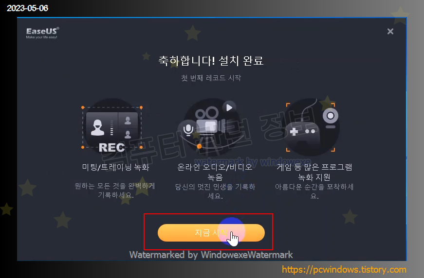 잠시 기다리면 프로그램 설치가 완료됩니다. 지금 시작 클릭