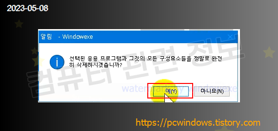 프로그램을 삭제할건지 물어보는데 예 클릭.