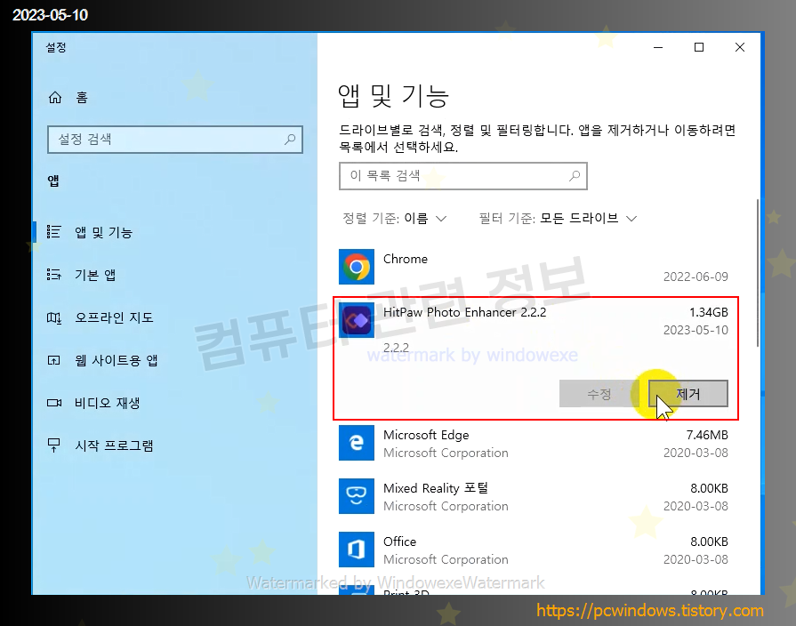 HitPaw Photo Enhancer 를 찾아서 제거클릭
