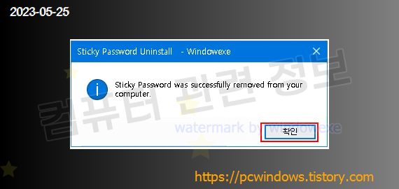 프로그램이 정상적으로 제거되었습니다. 확인 클릭.