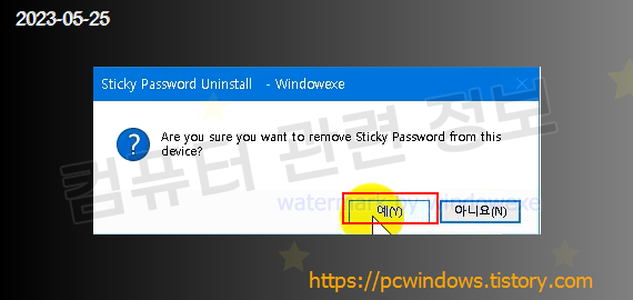 Sticky Password에 저장되어 있는 사용자 데이터까지 모두 지우려면 Yes 를 클릭하세요.