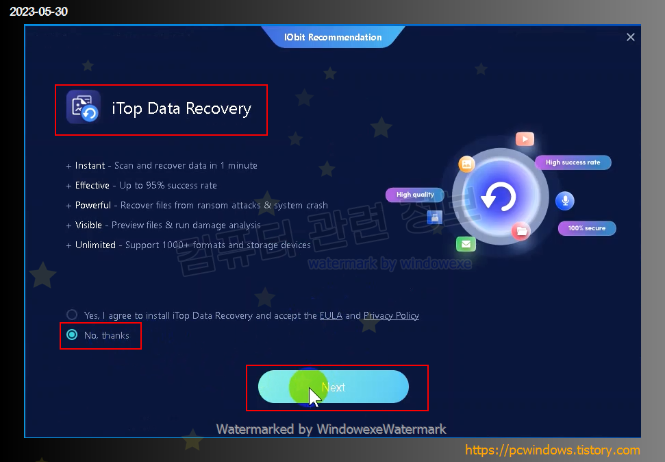 다음 화면에서도 스폰서 프로그램을 설치할건지 물어보는데 No thanks 체크하고 Next 클릭