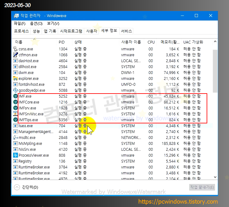 IMFsrv.exe , IMF.exe , IMFSrvWsc.exe , IMFCore.exe , IMFTips.exe 프로세스는 부팅시마다 자동으로 실행됩니다.