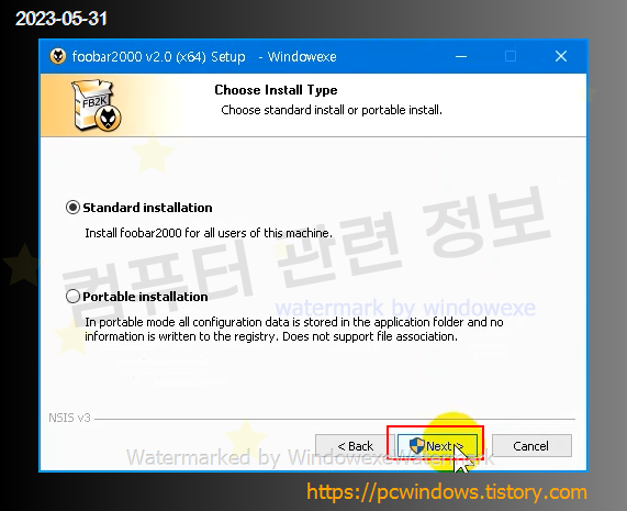 설치 버전 또는 포터블 버전, 원하는 타입을 체크하고 Next 클릭