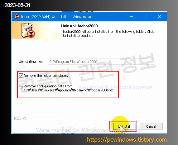 사용자 데이터 및 설정, 푸바 폴더까지 모두 지우려면 체크박스에 체크하세요.