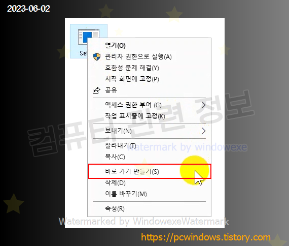 다운로드 받은 파일을 원하는 폴더에 넣고 마우스 우클릭, 바로가기 만들기를 클릭하세요.