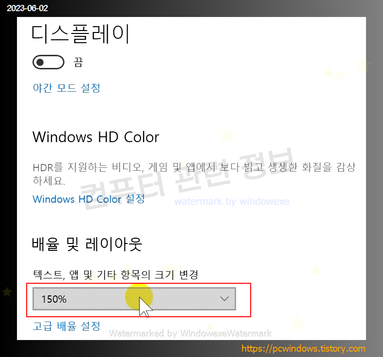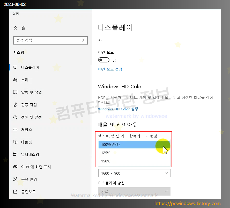 화면 배율은 100, 125, 150, 175, 200 이런식으로 모니터에서 지원하는 배율을 지정하면 됩니다.