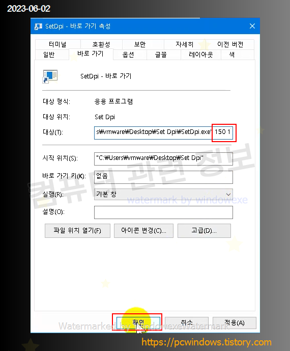 대상에는 경로가 자동으로 들어가 있기 때문에 원래 있던 값에 한칸을 띄운 다음 150 1 을 입력하고 확인을 누르세요.