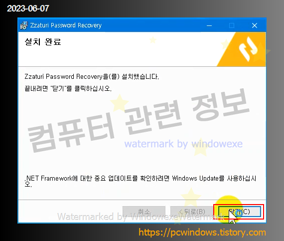 프로그램 설치가 완료되었습니다. 닫기 클릭