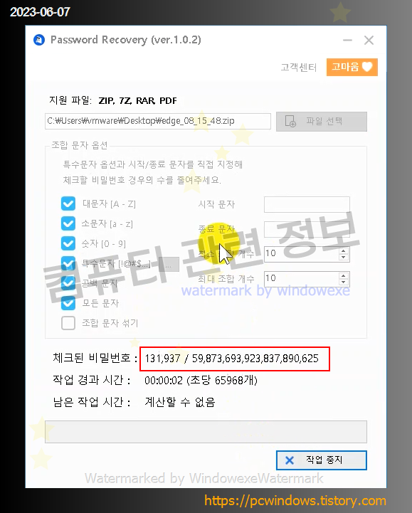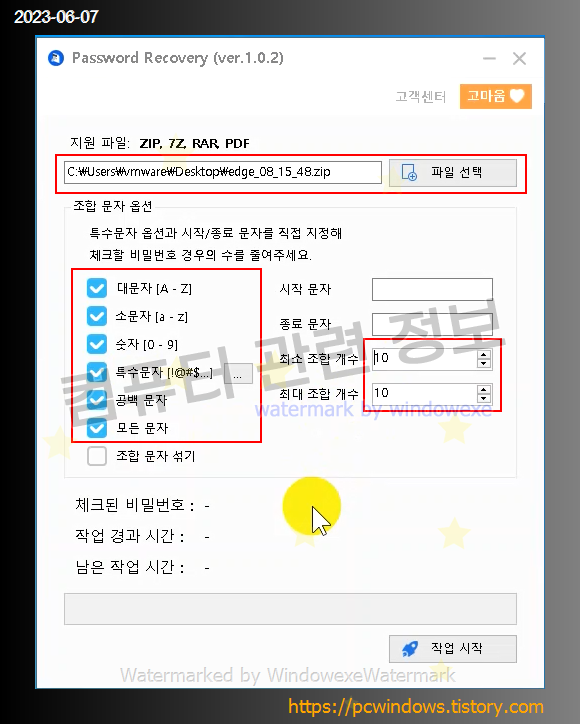 압축파일을 선택하고 조합 문자 옵션 및 길이를 설정하세요.