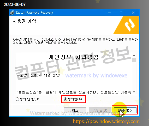 사용권 계약 동의에 체크하고 다음 클릭