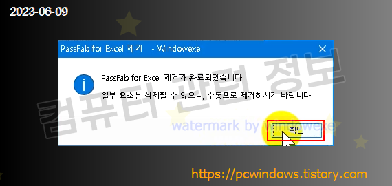 프로그램이 정상적으로 제거되었습니다. 확인 클릭.