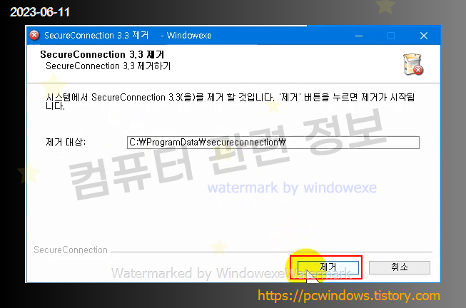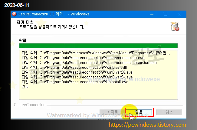 프로그램이 성공적으로 제거되었습니다. 닫음 클릭
