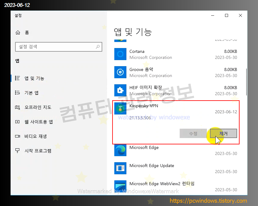 Kaspersky VPN Secure Connection 를 찾아서 제거클릭