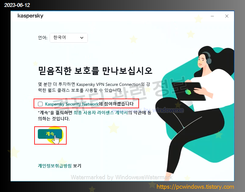 Kaspersky Security Network 참여는 필요없으니 체크해제하고 계속 클릭