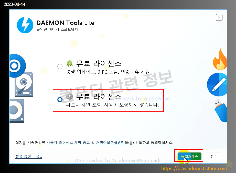 무료 라이센스에 체크하고 동의 계속 클릭